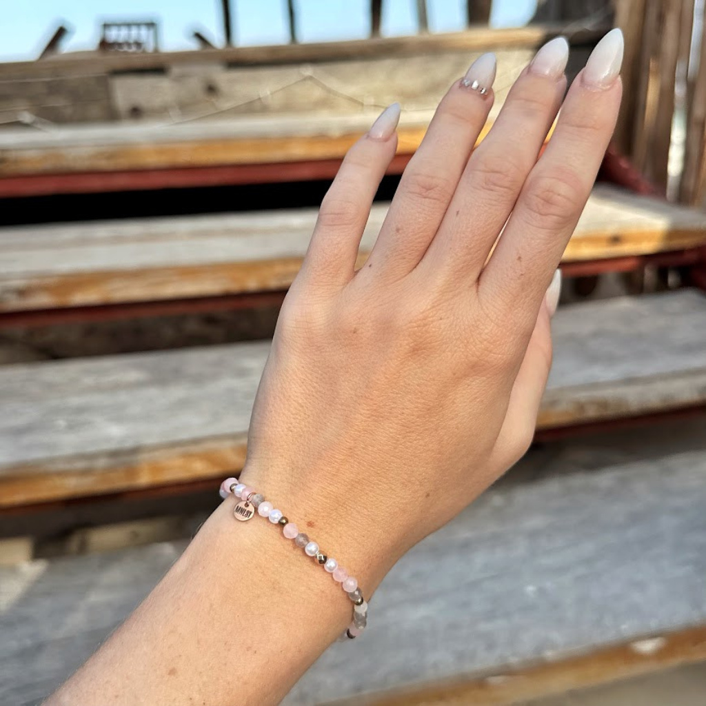 Jemný korálkový náramek v odstínech růžové, šedé a bílé působí něžně, čistě a velmi ženským dojmem. Kombinace drobných fazetovaných korálků s lesklými detaily vytváří harmonický celek, který se snadno kombinuje s každodenním outfitem i slavnostnějšími šaty.