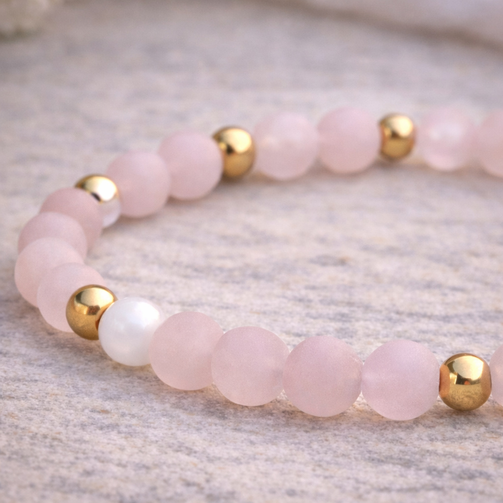 Jemný náramek v něžných růžových tónech, který působí klidně, čistě a přirozeně. Matné růžové korálky doplňuje bílý perleťový akcent a drobné zlaté detaily, díky kterým je náramek decentní, ale nepřehlédnutelný.