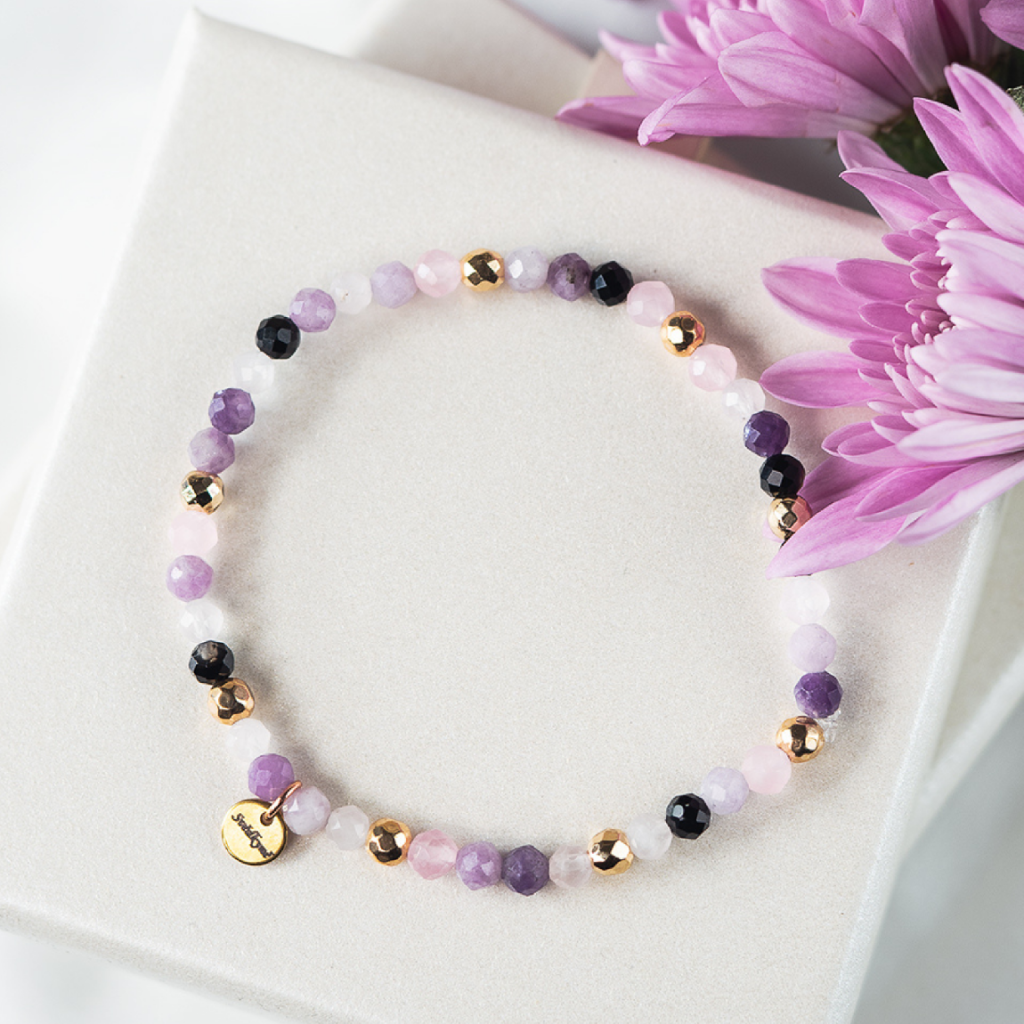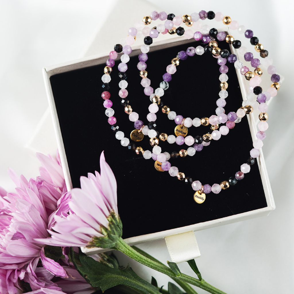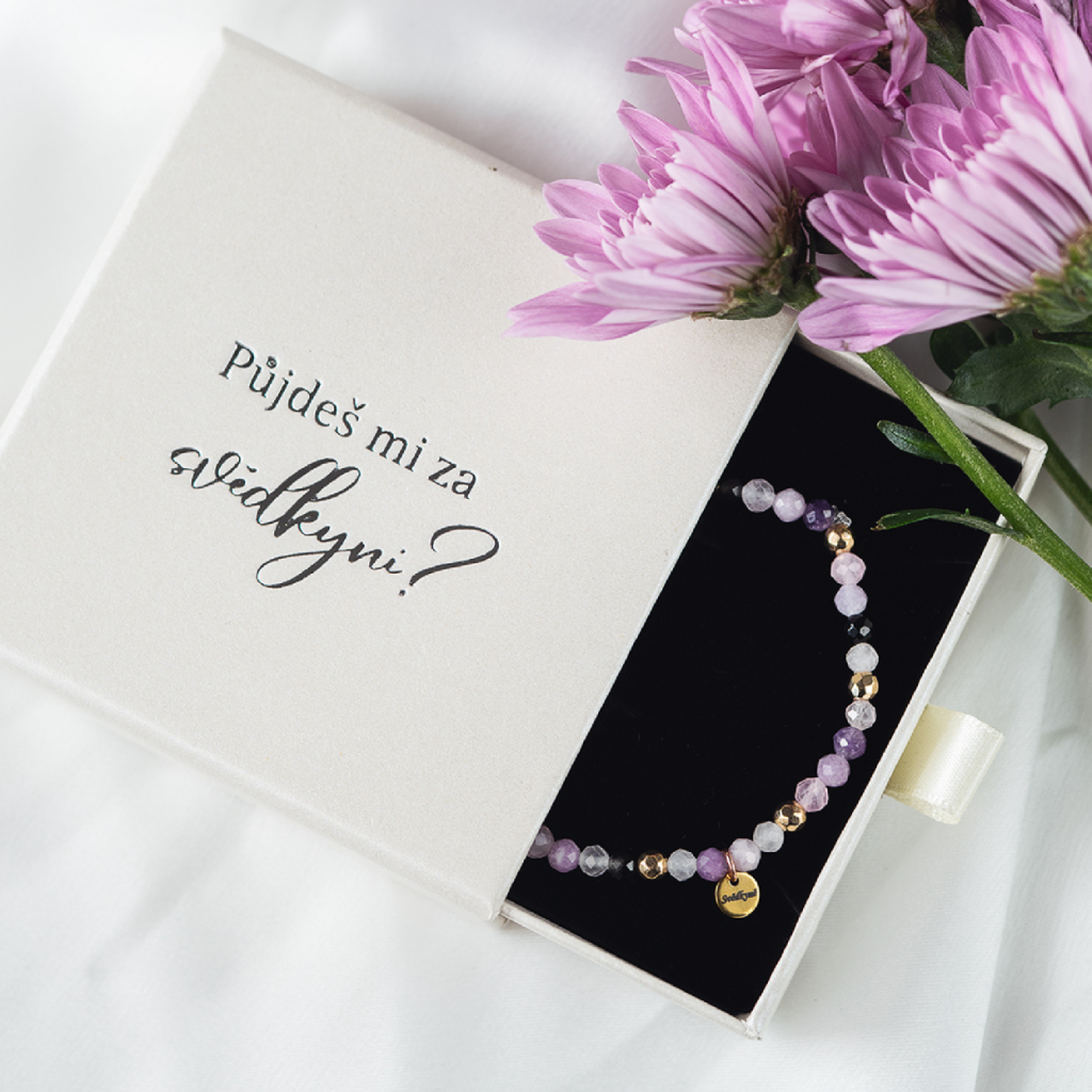 Jemný korálkový náramek v odstínech fialové působí něžně, čistě a velmi ženským dojmem.