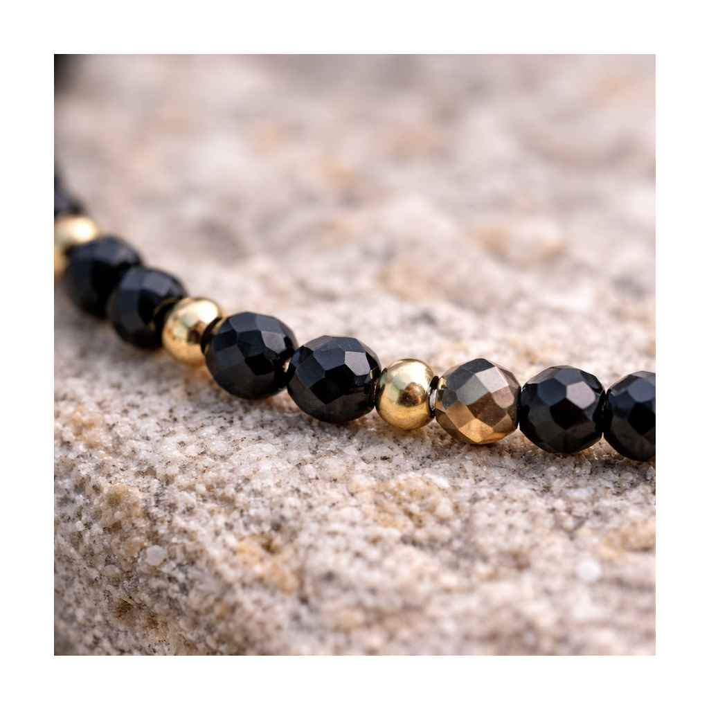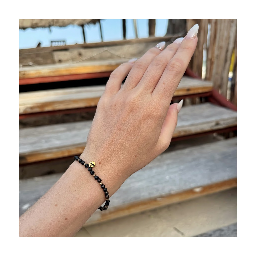 Jemný korálkový náramek v hlubokých černých odstínech doplněný drobnými zlatými detaily působí elegantně, minimalisticky a nadčasově. Kombinace lesklých fazetovaných korálků a kovových prvků vytváří kontrast, který náramku dodává výraz, aniž by působil těžce nebo nápadně.
