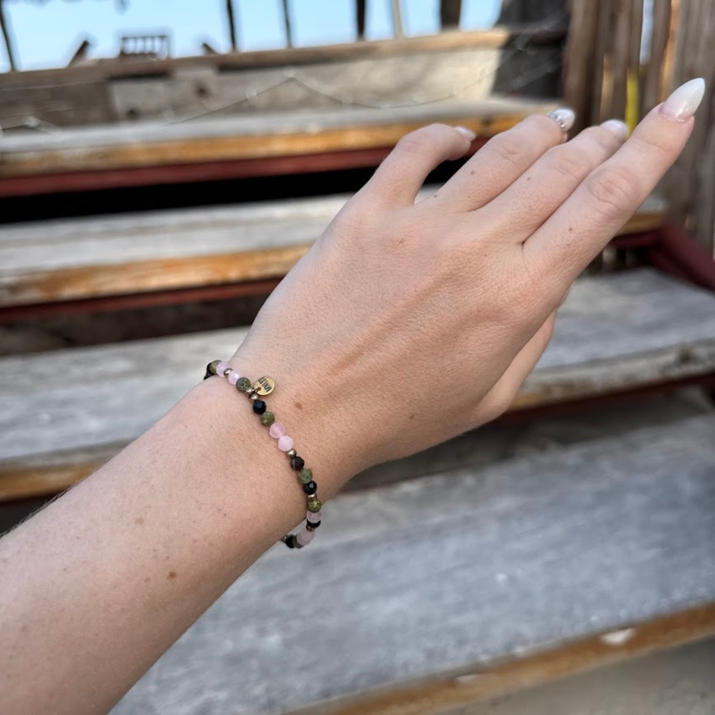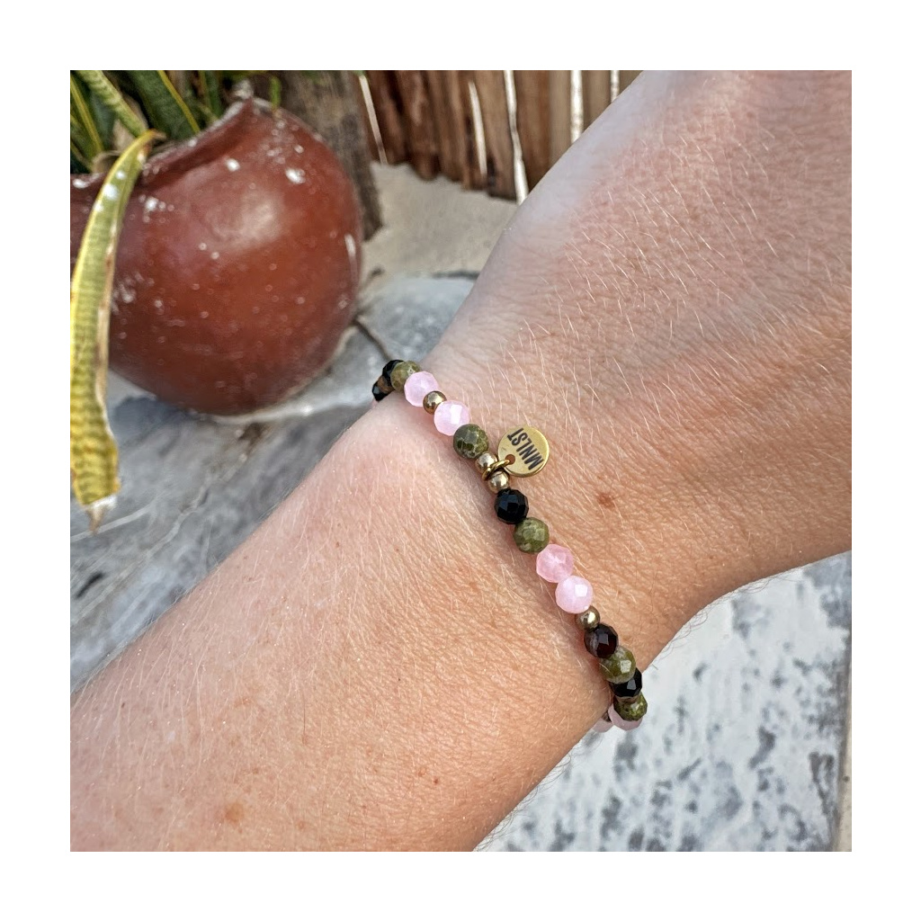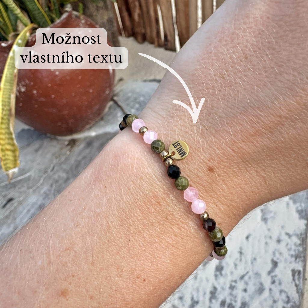 Náramek je složen z pečlivě vybraných přírodních kamenů v jemně kontrastních odstínech růžové, zelené a zemitých tónů, které spolu vytvářejí harmonický a přirozený celek.