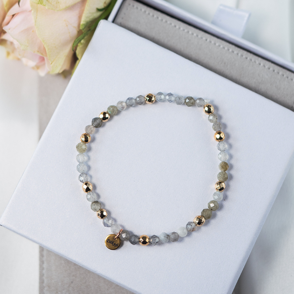 Náramek je složen z pečlivě vybraných korálků, které spolu vytvářejí jemnou a harmonickou kombinaci barev i struktur: