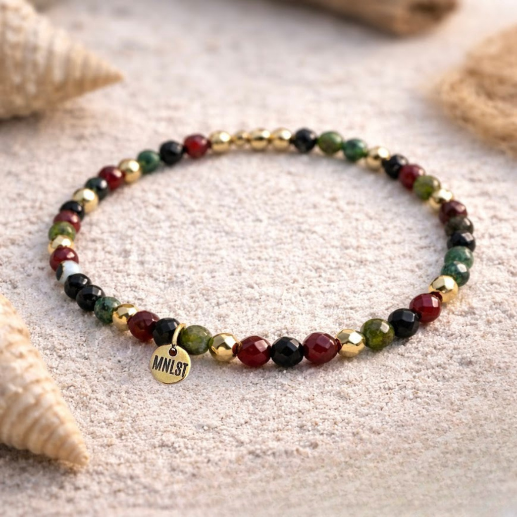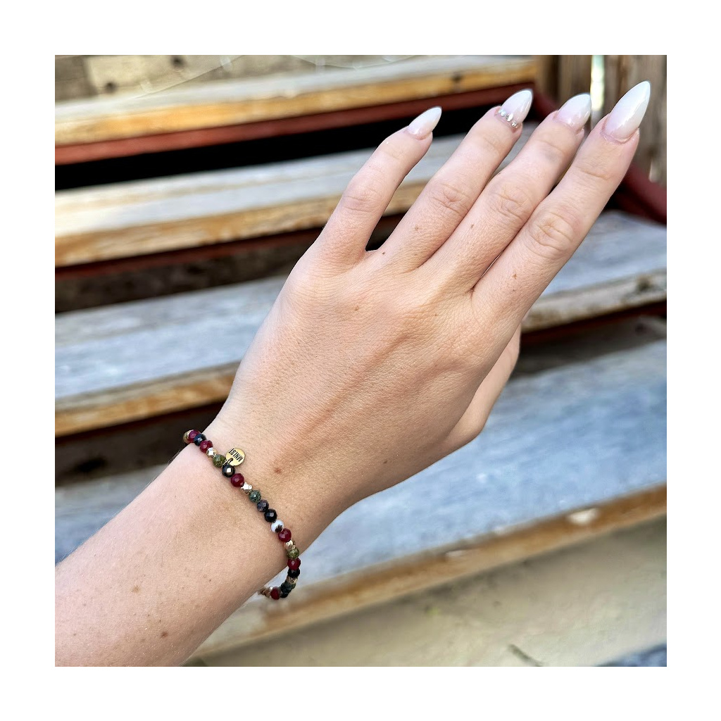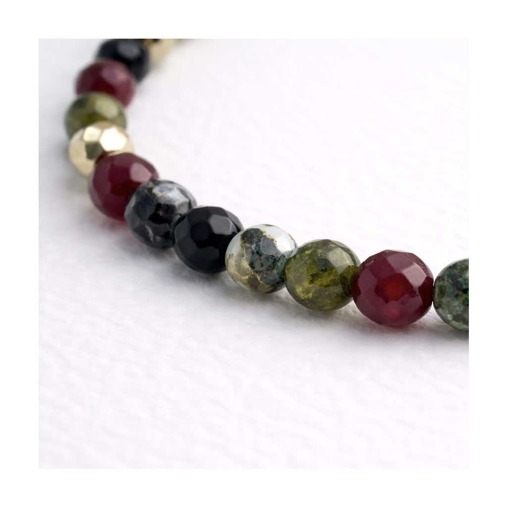 Minimalistický náramek v hlubokých vínových a zemitých tónech, doplněný jemnými zlatými detaily.